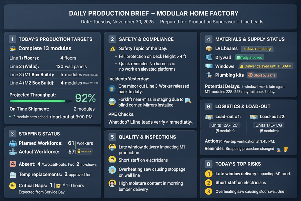 The brief explains the critical tasks, the priorities for each station, the items QC is watching, the material delays that affect sequencing, the staffing or safety concerns, the conversations that engineering or drafting need to complete, and the risks that could derail production if ignored.